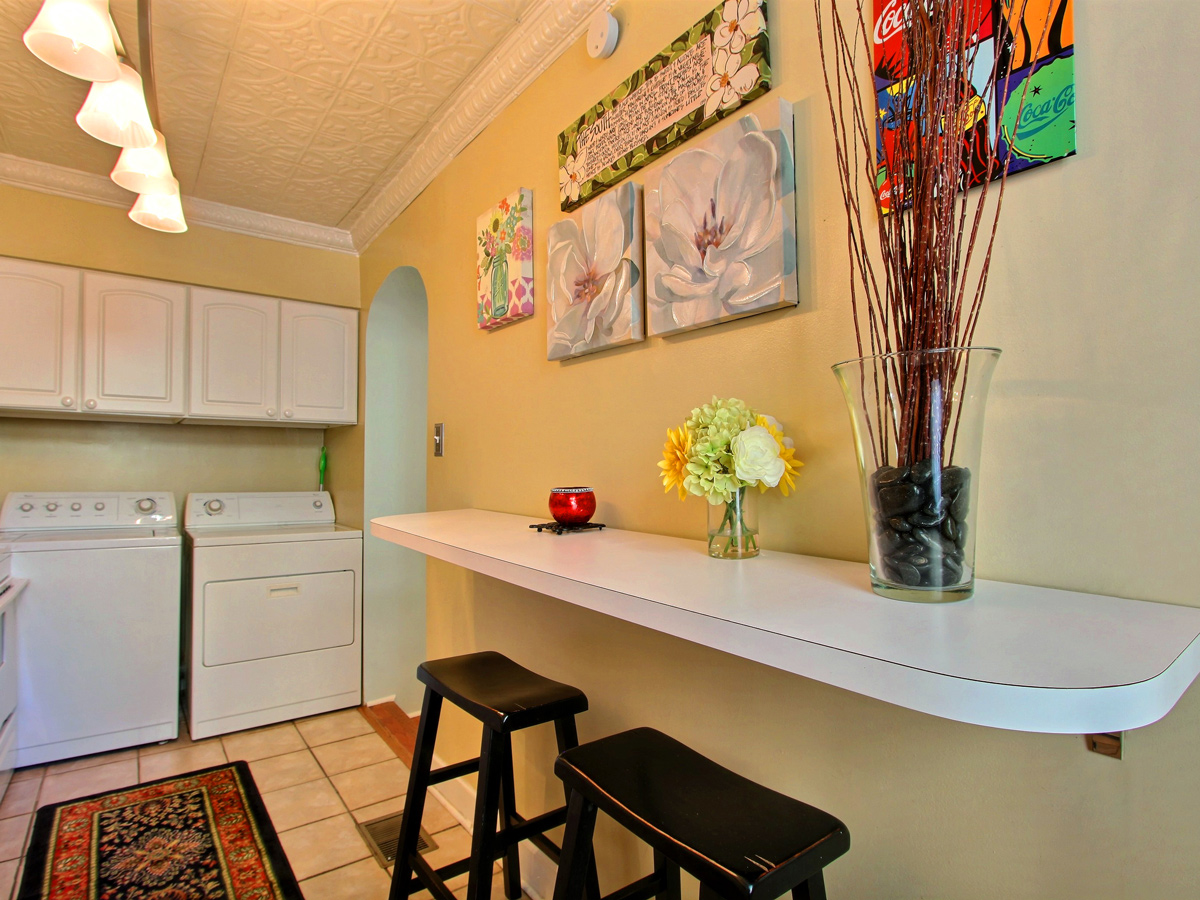 With a plush carpet you can sink your toes into and tasteful artwork surrounding you with a cool cultural vibe, the living room will be your go-to relaxation space during your tenure at the Liberty Street Retreat. Tune into the latest weather report on the flat screen television, take a few minutes to call home as you stretch out on the contemporary furnishings, or savor a tall, cool drink as you relax in one of the upholstered armchairs and review your day.